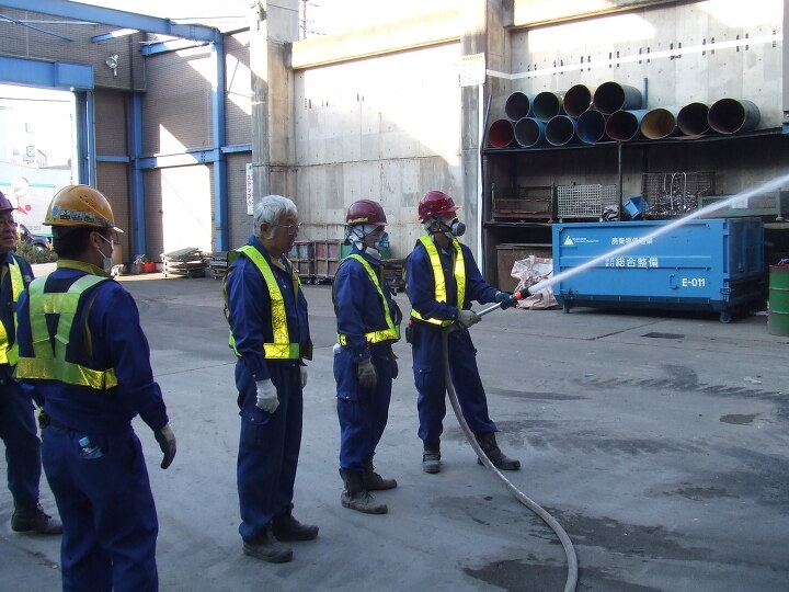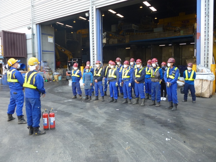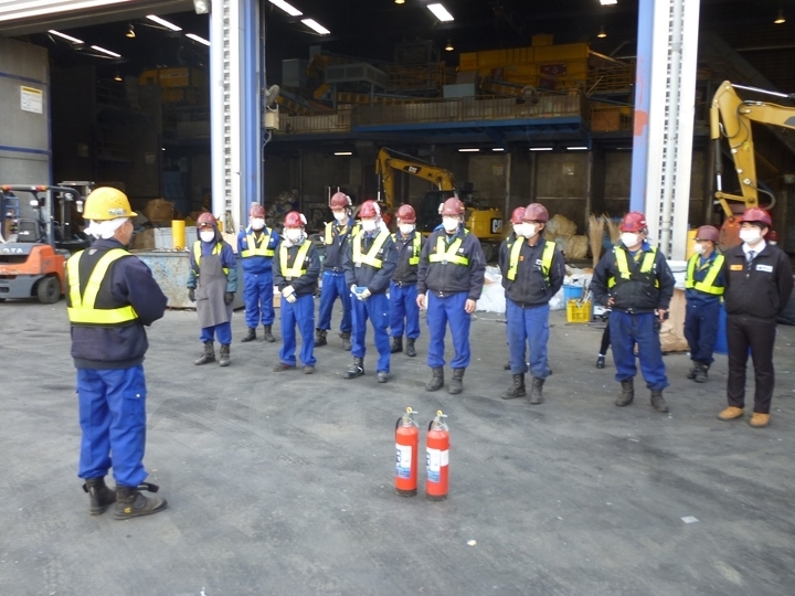 2月の東京都心は、92年ぶりの降水量の少なさを記録し、乾燥の日々が続いております。今回は、処理前廃棄物置場(木くず)からの出火と想定し、主に新人さんを中心に、消火器を使用した初期消火活動、及び放水銃を使用しての自社消火設備の動作確認をいたしました。