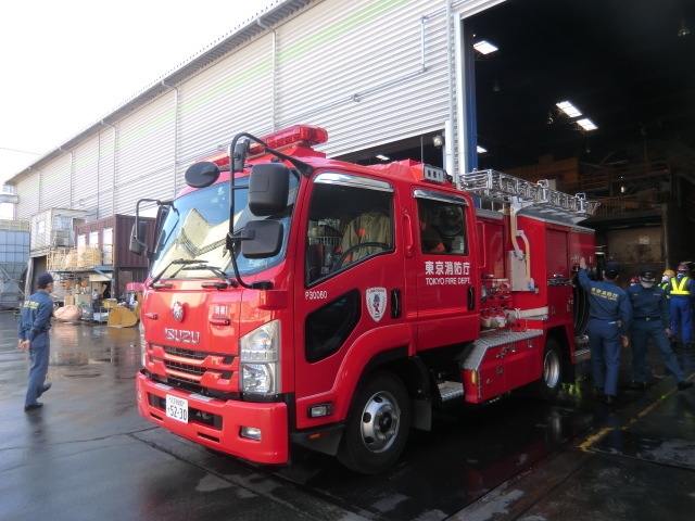 自社防火設備(自動放水、消火栓)を使用した初期消火活動、